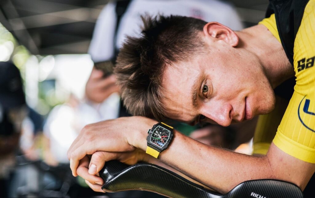 Richard Mille’s involvement in professional cycling reflects the same performance-driven philosophy seen in motorsport and athletics. The brand collaborates with elite cyclists such as Matthieu van der Poel and Tadej Pogačar, athletes who compete in disciplines defined by endurance, precision, and extreme physical stress. Both riders are known for wearing ultra-light Richard Mille timepieces during training, competition, and podium appearances; watches engineered to withstand constant vibration, impact, and long hours of exertion.