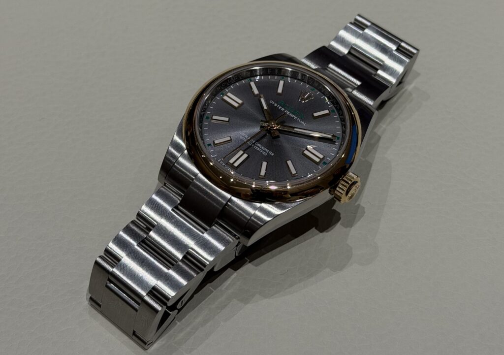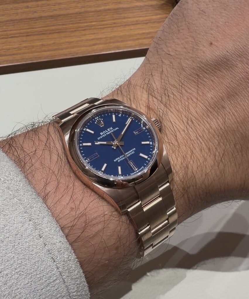 The Oyster Perpetual 34 in Everose gold with a blue dial is perhaps the most understated of the four. In general, the combination of blue and gold always looks amazing, however the warm tone of Everose gold in combination with the rich blue dial is insane in my eyes. Additional variants, including chocolate brown with diamonds and a black dial, expand the offering further. However, at €37.050, I must say the price for this model is kind of high. From a material standpoint, the gold content likely represents less than € 10.000 of the price. While this is typical for luxury watches, the gap feels particularly noticeable here given the simplicity and size of the piece. Nevertheless, Rolex is not selling the raw materials for their price, but the design, history, brand and the prestige.