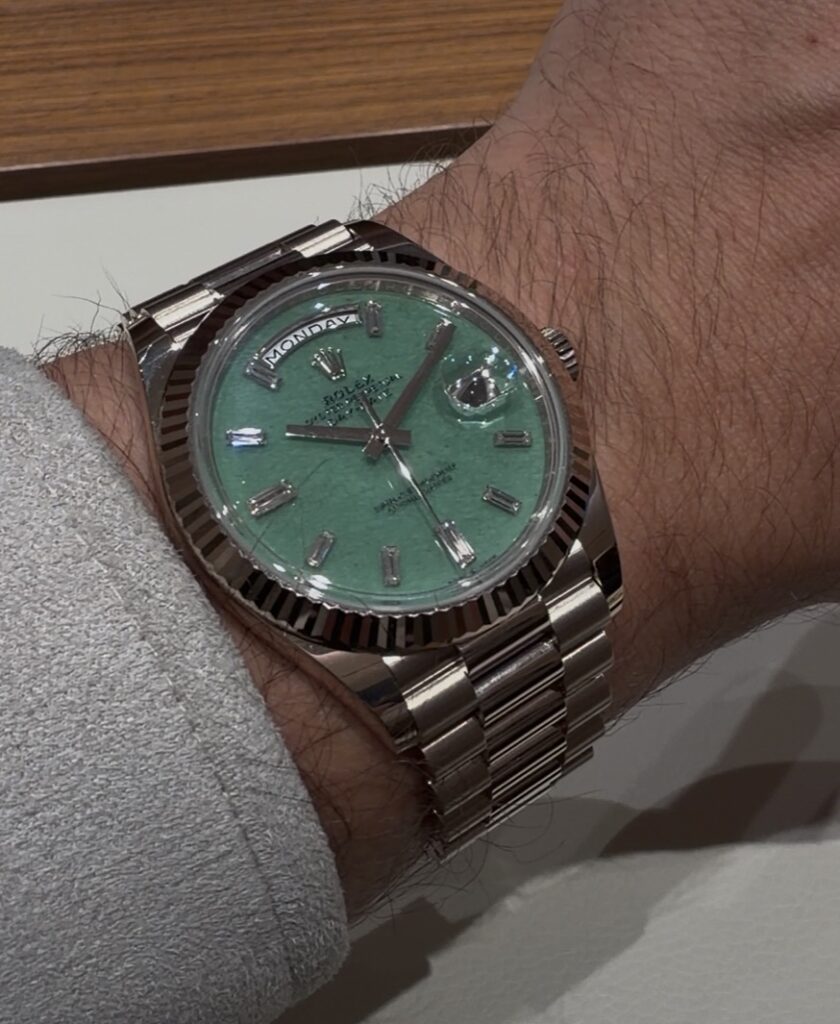 One of the standout pieces of 2026 is undoubtedly the Day-Date 40 with a light green aventurine dial. The dial is crazy to me. Aventurine, with its subtle sparkle, combined with the warmth of Rolex’s in-house 18 ct gold alloy. Rolex describes this gold as glowing in hues of tender yellow, warm grey, and soft pink, and that description feels surprisingly accurate in person. Ten baguette-cut diamonds complete the dial, adding just the right amount of brilliance without overwhelming the composition.