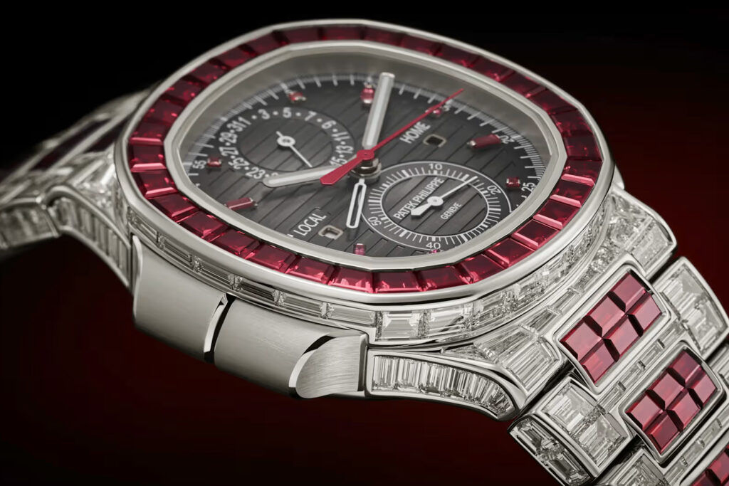 The Nautilus Travel Time Chronograph is already among the most technically sophisticated pieces in Patek Philippe’s catalogue, combining a flyback chronograph with a dual time zone and day/night indication. Dressing it in baguette-cut colored stones across both the bezel and bracelet links is, by any standard, an extraordinary exercise in ambition.