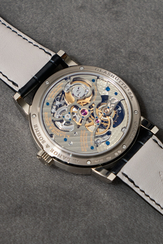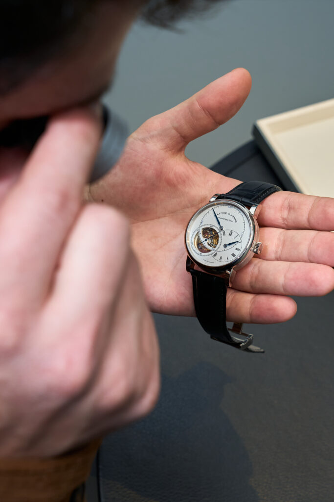 Compared to the pieces we had just explored, this is “just” a time-only watch, but in true Lange fashion, there is nothing simple about it. The 40.5 mm pink-gold case frames a stunning silver dial, whose clarity is elevated by the deep blue of the hands. The contrast is crisp, elegant, timeless.