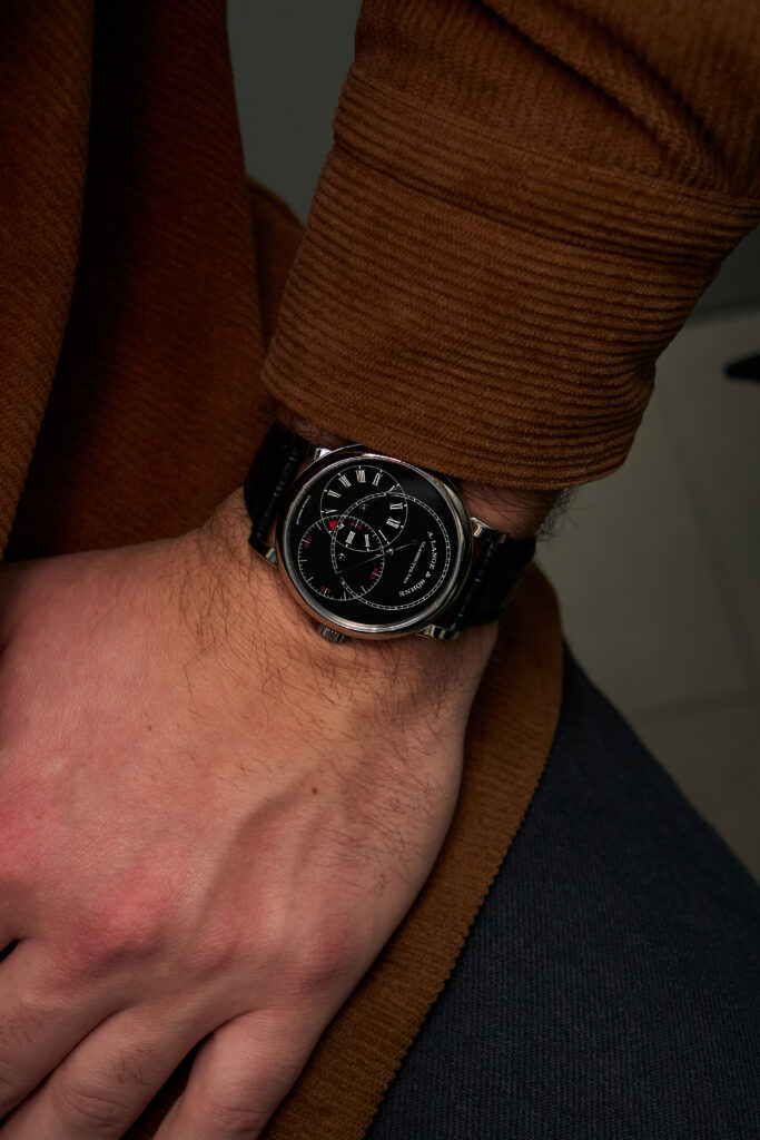 The layout is once again regulator-style, inspired, like the Tourbillon, by the historic Chronometer No. 93. At the top of the dial sits the jumping seconds display: a true “deadbeat” seconds hand that advances in precise one-second increments. Minutes are positioned at the lower right, hours at the lower left. The architecture is technical, almost scientific, yet unmistakably elegant.