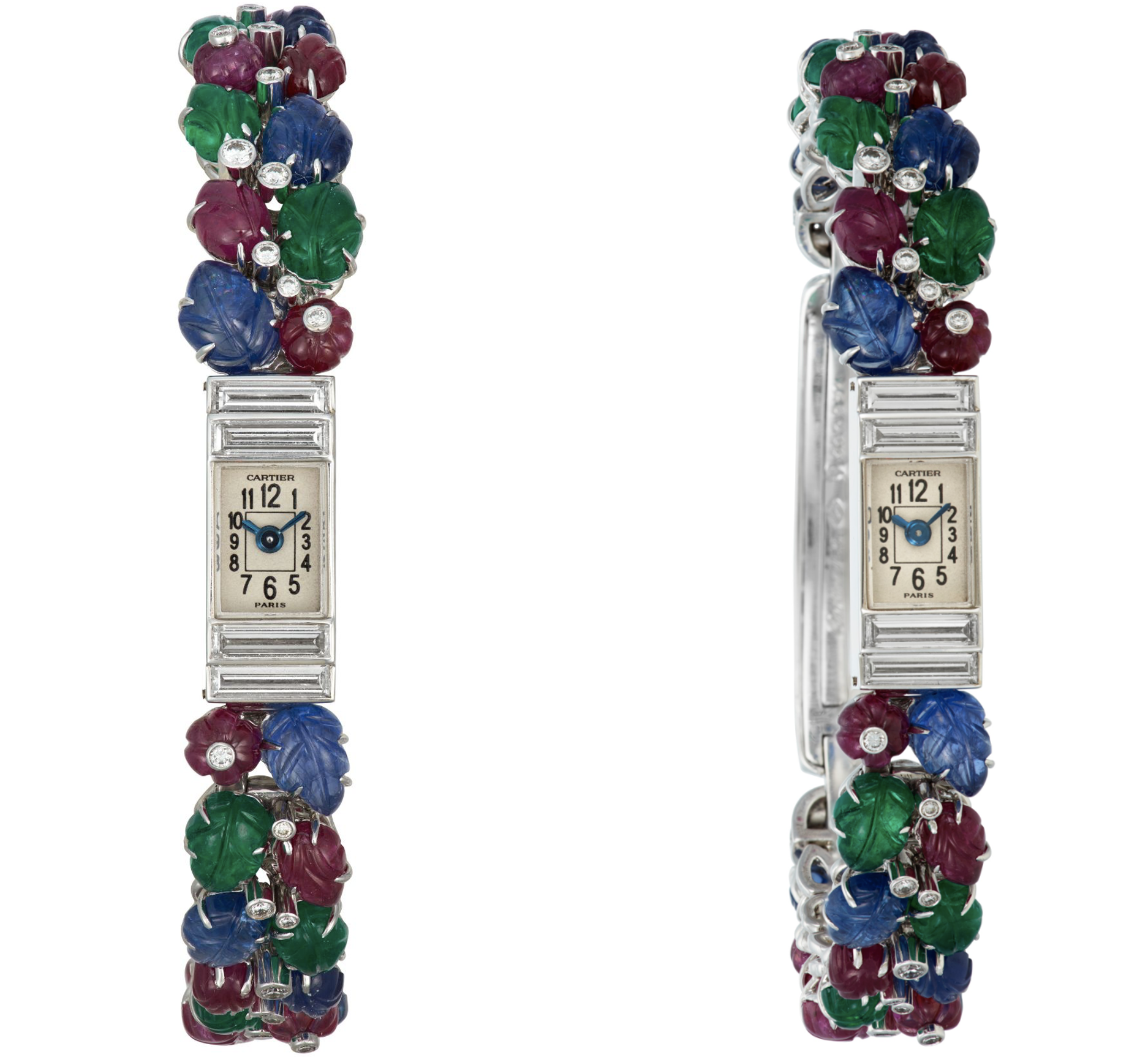 Surviving examples of Cartier’s Tutti Frutti wristwatches are exceptionally rare. One notable example featuring carved rubies, sapphires and emeralds set with round and baguette-cut diamonds in platinum and 18k white gold, was offered from a distinguished private collection and sold at Christie’s for US$425,000, significantly above its pre-sale estimate. This result reflects both the intrinsic worth of its precious materials and the piece’s significance as an artefact of interwar luxury and design innovation. Such watches today occupy a special place in the market: treasured not only for their gem-set splendour but also as historic objets d’art that epitomise the Jazz Age fusion of high jewellery and horology.