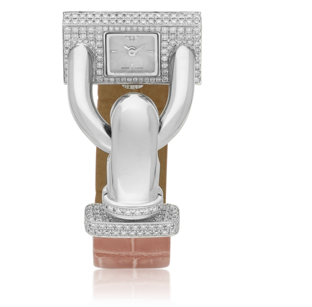 The geometry of the Cadenas is unmistakably modern, combining clean architectural lines with sculptural curves. Early examples were produced in precious metals such as yellow gold, but the most celebrated and valuable versions were executed in platinum or white gold and entirely set with diamonds for elite clients. In these high jewellery interpretations, the watch transcended its functional purpose and became a couture object.