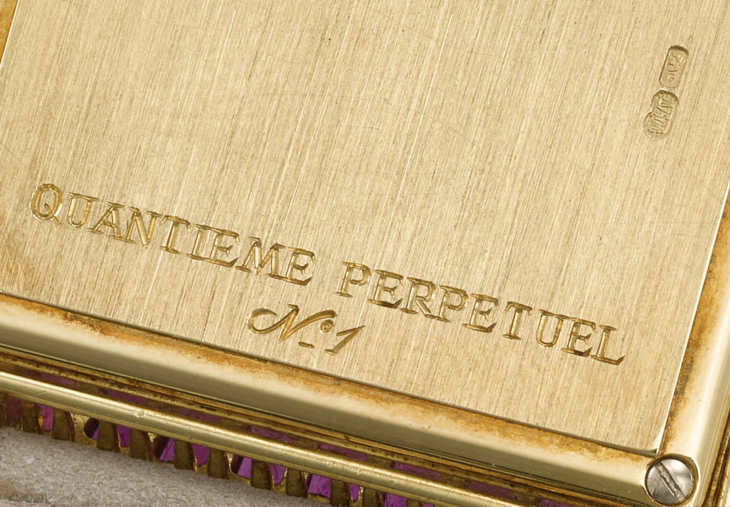 A telling example of this approach is the square 18k yellow gold perpetual calendar produced around 1994. Its bezel is set with 60 bespoke baguette-cut sapphires, each stone individually angled and cut to follow the sharp geometry of the square case, for a total weight of approximately 7 carats. This was not a standardised solution but a deliberate design choice, requiring custom gem cutting and meticulous setting to achieve visual continuity around the case.
