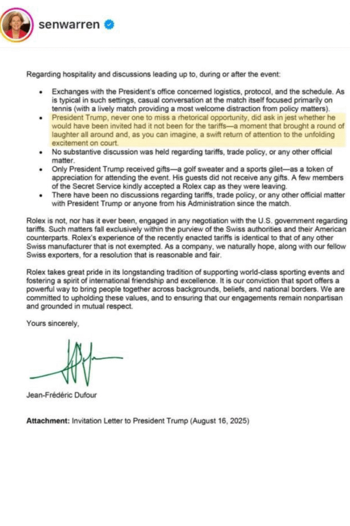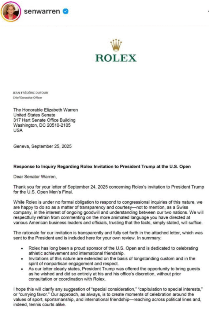 In response to the speculations, and following a formal request made by Senator Elizabeth Warren, Rolex promptly issued an official press release, categorically denying any kind of private negotiation with the American president. The brand reiterated its integrity and compliance with international regulations, emphasizing that the meeting took place exclusively in a representative context and without any commercial implications.